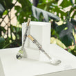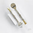 Bombillon torneado con detalle de hoja en alpaca, detalles en bronce y cobre. Excelente e impactante diseño. Mide 18.5 cm de largo.